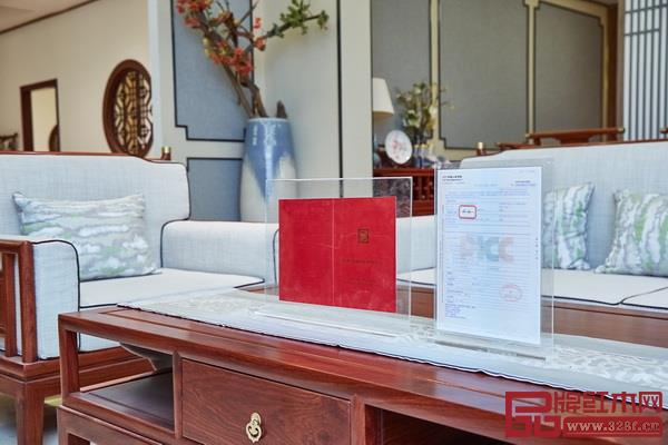 居典紅木展廳內(nèi),產(chǎn)品上放置了“紅木家具”產(chǎn)權(quán)證