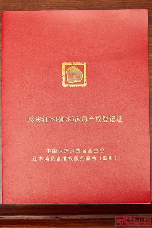 走進居典紅木展廳,家具上的小紅本映入眼簾,當看到封面上的金色字《珍貴紅木(硬木)家具產(chǎn)權(quán)登記證》中國保護消費者基金會紅木消費者維權(quán)服務(wù)基金監(jiān)制,筆者便確認這就是傳說中的紅木家具“產(chǎn)權(quán)證”。