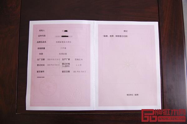《珍貴紅木(硬木)家具產(chǎn)權(quán)登記證》封面及內(nèi)頁之一
