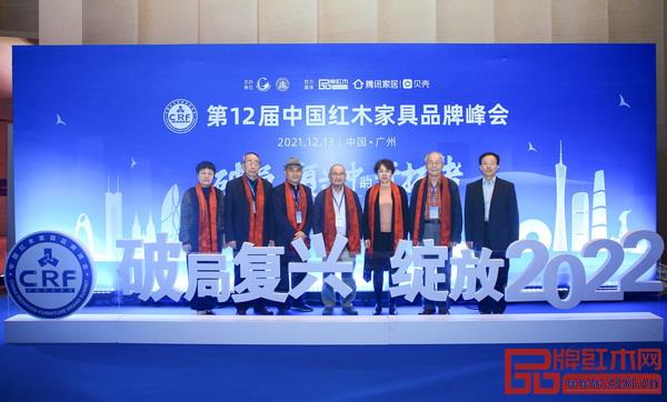 檀一新中式創(chuàng)始人叢東云(右三)與全聯(lián)藝術紅木家具專業(yè)委員會專家顧問團——胡景初(中)、曹新民(左二)、李凱夫(右一)、蘇垣(右二)、王周(左三)、郭瓊(左一)在第12屆紅木品牌峰會現(xiàn)場留影