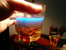 三:取木屑放入盛有清水的玻璃杯中(木屑與水的比例:體積比大約1:3——1:10),若是檀香紫檀則過12小時可見水的最上層(視覺效果:水的最上層和玻璃杯壁附近最明顯)有藍色機油般熒光現(xiàn)象,過24小時熒光更明顯,此步主要用于排除盧氏黑黃檀等其他酸枝木和非紫檀屬木材;若有熒光現(xiàn)象繼續(xù)下一步。