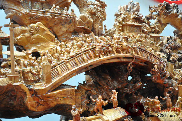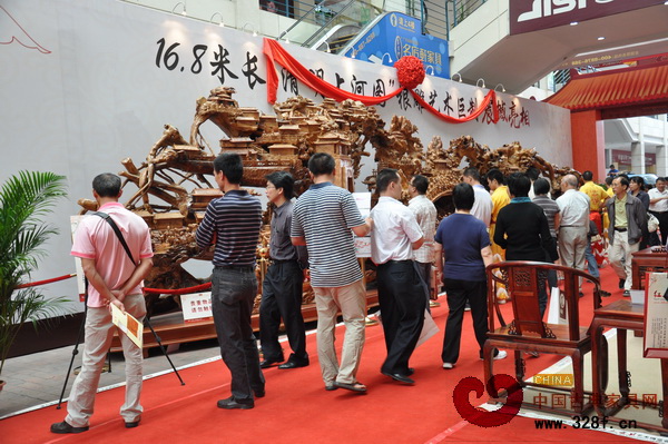 在博覽會(huì)展館的后半展區(qū)中,展出了一幅長(zhǎng)達(dá)16.8米的《清明上河圖》。為什么紅木家具博覽會(huì)會(huì)展出“一幅畫”呢?原來(lái)這“副”《清明上河圖》是一個(gè)巨大的根雕作品。這一作品的原木是一株生長(zhǎng)在江西崇山峻嶺原始森林中的大香樟古木,樹齡在1500年以上,樹高百米,樹干直徑3米,根徑13米,完全暴露風(fēng)干近10年。作品以北宋畫家張擇端的《清明上河圖》為藍(lán)本,由福建15位工藝美術(shù)大師和工匠歷時(shí)5年,經(jīng)構(gòu)思創(chuàng)意、選材干料、精雕細(xì)刻而成。雕刻完成后,作品全長(zhǎng)16.8米,高3米,寬1.6米,重16噸,塑造了300多個(gè)形象生動(dòng)、表情不一、栩栩如生的人物,使《清明上河圖》原作上的人物更為立體化。據(jù)收藏專家初步評(píng)估,其價(jià)值已超過(guò)1800萬(wàn)元。
