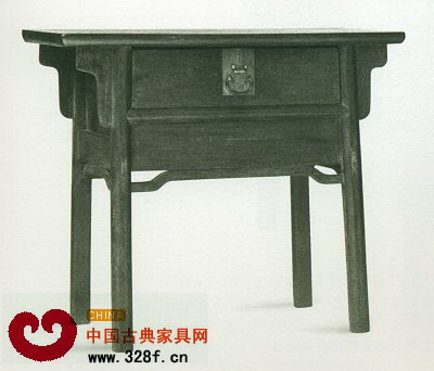 這是一件明代的民間家具。它有抽屜一具,無翹頭,不僅通體光素?zé)o紋,櫥面大邊用透榫,抽屜面用明榫,悶倉之下用羅鍋棖代替了牙條。尤其是兩側(cè)面,使用了意想不到的又寬又厚的大材作悶倉的立墻,使人感到過于要求堅實而置笨拙于不顧,但同時卻帶來了樸質(zhì)率真的趣味。