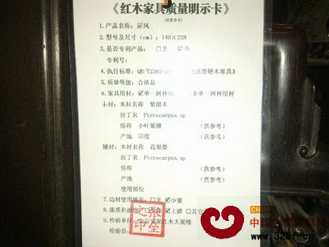 據(jù)記者了解,《深色名貴硬木家具》行業(yè)標準中很重要的一點就是要求企業(yè)在出售家具時必須做到質(zhì)量明示,而質(zhì)量明示應通過質(zhì)量明示卡來體現(xiàn)。