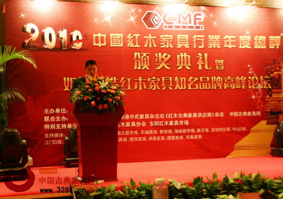 此次盛會以“2010中國紅木家具行業(yè)年度總評榜頒獎典禮暨如何打造紅木家具知名品牌”為主題,旨在推舉出一批優(yōu)秀紅木家具品牌的同時,提升紅木家具企業(yè)的品牌意識,加強紅木家具企業(yè)的品牌建設(shè),促進紅木家具行業(yè)的和諧與可持續(xù)健康發(fā)展。在頒獎典禮上,主辦單位頒發(fā)了“紅木家具十大新聞”、“紅木家具風(fēng)云人物”、“紅木家具十大品牌”、“紅木家具最佳賣場”等多個獎項。其中,中山市紅古軒家具有限公司憑借不懈努力,以及對顧客的認真與負責(zé),獲得了“2010年最受歡迎的中國紅木家具十大品牌”此殊榮;而紅古軒公司總經(jīng)理吳赤宇先生,以其對于紅木的熱愛,對紅木家具造型、結(jié)構(gòu)、文化內(nèi)涵的獨到見解及其對社會的貢獻,被評為“2010年中國紅木家具行業(yè)風(fēng)云人物”。