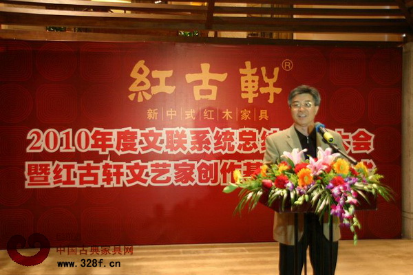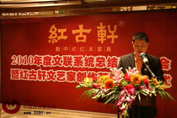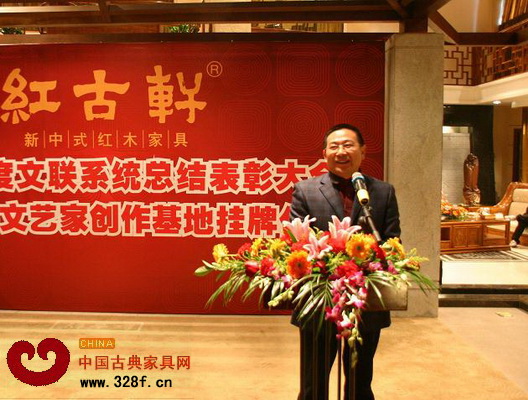 2011年1月14日,2010年度文聯(lián)系統(tǒng)總結(jié)表彰大會(huì)暨紅古軒文藝家創(chuàng)作基地掛牌儀式,于紅古軒紅木家居文化體驗(yàn)館隆重舉行。廣東省中山市委常委宣傳部部長邱樹宏先生,廣東省中山市文聯(lián)主席胡波先生、中山市大涌鎮(zhèn)副鎮(zhèn)長周長甫先生等領(lǐng)導(dǎo),以及各協(xié)會(huì)代表、各分會(huì)代表、媒體朋友等近300人出席了本次盛會(huì)。