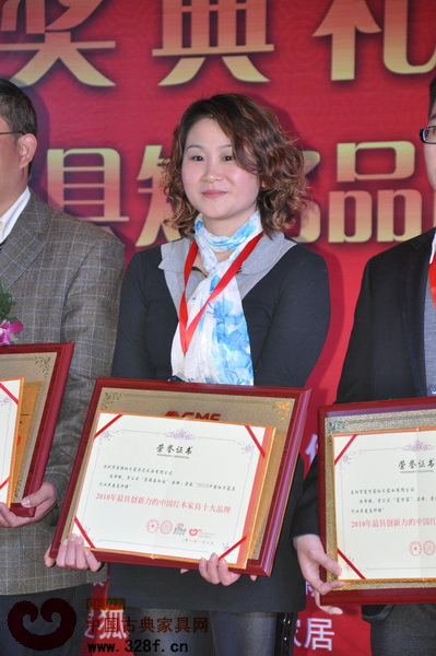 2010年最具創(chuàng)新力的中國紅木家具十大品牌頒獎(jiǎng)(右三為剛藝領(lǐng)獎(jiǎng)代表)