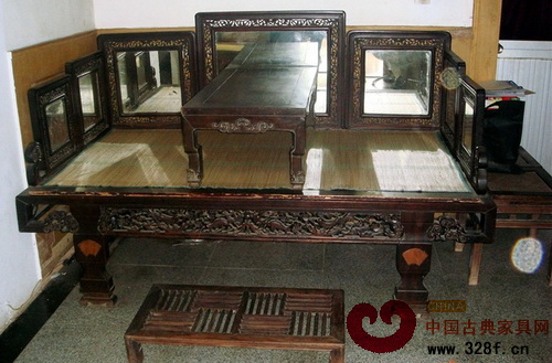秀寶作品:清晚期紅木鏤空雕花七屏鏡羅漢搭腳踏床