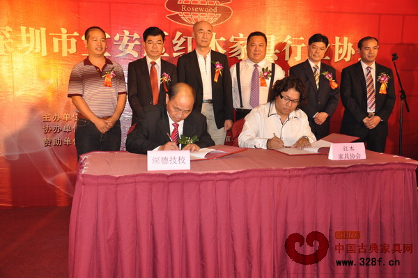 深圳紅木家具協(xié)會常務(wù)副會長戴愛國先生與深德技校校長李涴林先生簽訂了校企聯(lián)合的合作條約