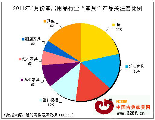 [摘要]搜索風(fēng)云榜統(tǒng)計(jì)買(mǎi)家數(shù)據(jù),我們分析得出4月份“家具”產(chǎn)品關(guān)注指數(shù)報(bào)告。如圖:關(guān)注度最高的是“椅”類(lèi)產(chǎn)品,占比達(dá)22%,其次的關(guān)鍵詞是“樂(lè)從家具”占比15%,床類(lèi)也占15%的關(guān)注度,“整體櫥柜”依舊熱門(mén),占比也較高達(dá)到12%,其他關(guān)注較高的類(lèi)別還有“辦公家具”10%、“紅木家具”6%、“酒店家具”4%及其他家具。