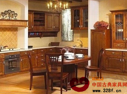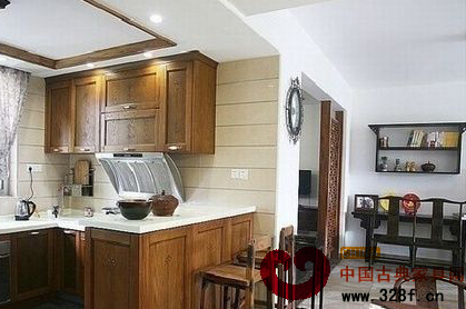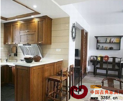 廚房裝修,木制椅子與吧臺(tái)是中式風(fēng)格的亮點(diǎn)。