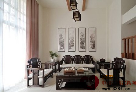 客廳深色稍顯沉重的家具擺置,配以背景素框白底的水墨寫意。