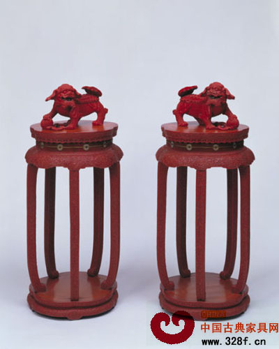 紅雕漆香幾(一對):清 乾隆,高90厘米,直徑45厘米;