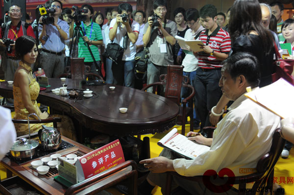 “如果只是一個功能架,很難體現(xiàn)出文化和創(chuàng)意;如果和茶水臺、木椅組合在一起,既能體現(xiàn)舒適,又能體現(xiàn)出創(chuàng)新的工藝,我給你打高分!”在水雨軒功夫茶具展位,兩位故宮專家敲了敲茶水臺,體驗了木椅后,當場點評,并給家具企業(yè)負責(zé)人支招。幾件家具組合在一起后,曹靜樓先生立馬把該系列作品的文化創(chuàng)意項增加了14分。最終,該作品攬獲特別金獎。