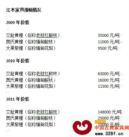 從國內(nèi)某知名紅木家具生廠商提供的原材料價格清單來看,從2009年至2011年,各類紅木家具的原材料成本較之過去呈現(xiàn)翻倍增長趨勢。根據(jù)清單顯示:老撾紅酸枝2009年價格僅為35000元/噸,2010年翻番價格上升為63000元/噸,2011年9月份又在2010年基礎(chǔ)上翻番,成交價為148000元/噸;緬甸酸枝則在2009年的11000元/噸,價格飛漲到如今的25000元/噸;就連紅木家具中較為便宜的緬甸花梨,價格也從2009年的9500/噸上漲到目前的15000元/噸。 “近來緬甸、老撾等東南亞紅木原產(chǎn)地減少對紅木的砍伐力度,這導致了市場上的紅木原材料數(shù)量急劇減少。同時,關(guān)稅也有所提高,在此情形下,我們不得以做出調(diào)價的舉措”。祥利工藝家私有限公司董事總經(jīng)理戴愛國表示。在此情形下,友聯(lián)做出漲價15%-20%的決定。同時,記者了解到國內(nèi)知名紅木家具品牌如龍順成、連天紅、深發(fā)也將漲價提上議程,目前就漲幅問題在做市場調(diào)研,預計10月底完成調(diào)價。而像元亨利、美聯(lián)、深發(fā)、厚德、宣明典居等企業(yè)早已先行,“十一”后店內(nèi)價格便發(fā)生變動,如元亨利新品價格上調(diào)15%,宣明典居小葉紫檀家具上調(diào)15%。