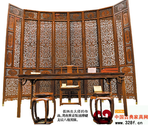 在本屆展會(huì)上,最搶人眼球的無疑是中國(guó)工藝美術(shù)協(xié)會(huì)副理事長(zhǎng)伍炳亮大師的作品:海南黃花梨透雕螭龍紋八扇圍屏。該圍屏每一處雕功都非常精細(xì),高度達(dá)到3.4米,寬4.7米,耗材達(dá)兩千余斤,雕工精細(xì)嚴(yán)謹(jǐn),型制恢宏壯觀。據(jù)伍炳亮先生介紹,在上世紀(jì)八十年代,海南黃花梨木材還相對(duì)較多,因此選材用料往往厚重大氣。據(jù)市場(chǎng)估價(jià),該圍屛的價(jià)值超過1億元。這件傳世之作引起了明清家具愛好者的圍觀。