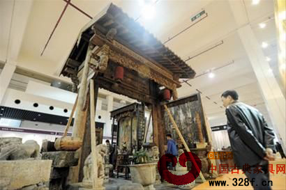 據(jù)這位專營山西古典家具的展商介紹,這座清代修建的門樓有200多年歷史,門樓收購自一處山西民居。展商為這座百年歷史的門樓報出了二十萬元的零售價。木結(jié)構(gòu)的門樓雖然身材巨大,但由于可拆卸,運(yùn)輸并不算困難,不過組裝卻要花上不少時間,展商說光是在展會現(xiàn)場臨時搭建這座門樓,就花去了兩天時間。