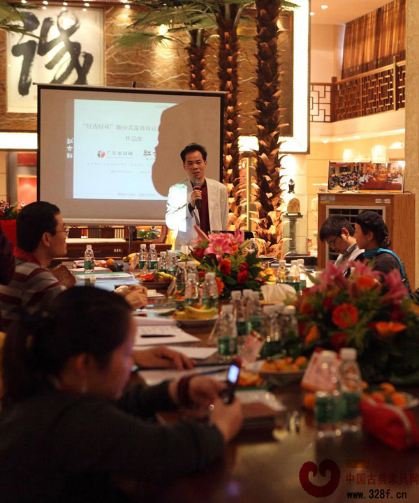 2011年11月26日,歷經(jīng)10個(gè)多月籌備、推廣、征集,由廣東省家具協(xié)會(huì)主辦,中山市紅古軒家具有限公司承辦的“紅古軒杯”新中式家具設(shè)計(jì)大賽之初賽評(píng)選活動(dòng),于中國(guó)紅木家具生產(chǎn)鎮(zhèn)——大涌鎮(zhèn)盛大啟動(dòng)。廣東省家具協(xié)會(huì)會(huì)長(zhǎng)王克先生、中山市大涌鎮(zhèn)黨委書記黃紅全先生、中山市大涌鎮(zhèn)黨委委員謝巧明先生、廣東省家具協(xié)會(huì)秘書長(zhǎng)張承志先生,以及來(lái)自祖國(guó)四面八方的10多位家具界資深專家、老師匯集一堂,相約在紅古軒家居文化體驗(yàn)館,共同為“紅古軒杯”新中式家具設(shè)計(jì)大賽出謀劃策,把脈建言。評(píng)選儀式上,廣東省家具協(xié)會(huì)會(huì)長(zhǎng)王克先生、中山市大涌鎮(zhèn)黨委書記黃紅全先生、中山市大涌鎮(zhèn)黨委委員謝巧明先生、紅古軒總經(jīng)理吳赤宇先生分別作了相關(guān)致辭。