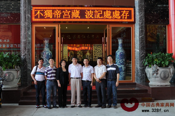 故宮專家曹靜樓(左四)、中國傳統(tǒng)家具研究會秘書長高肅(右二)、沙溪鎮(zhèn)副鎮(zhèn)長梁冬曉(左三)等領(lǐng)導(dǎo)參觀波記展廳