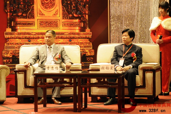中信紅木董事長李忠信(左)在紅木家具行業(yè)發(fā)展高峰論壇上分享經(jīng)驗