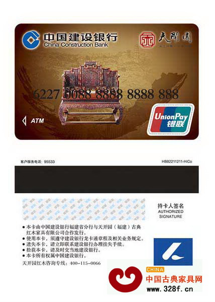 [摘要]中國(guó)建設(shè)銀行福建省分行攜手天開(kāi)園(福建)古典紅木家具有限公司,日前聯(lián)合發(fā)行了國(guó)內(nèi)首張高檔紅木家具聯(lián)名卡天開(kāi)園紅木家具龍卡。