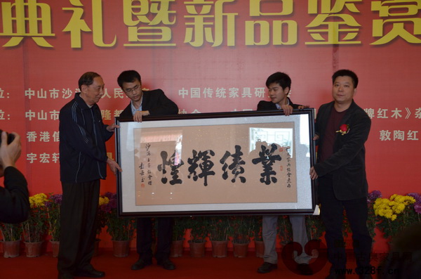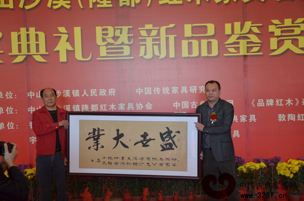中山市沙溪書畫協會會長劉少林先生向裕華興家具有限公司致送其書法作品“盛世大業(yè)”
