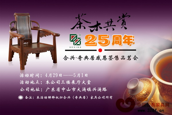 2012年4月29日至2012年5月1日舉辦“茶木共賞—合興奇典居25周年感恩簽售品茗會”。合興奇典居自1987年至今已有25年歷史,企業(yè)如今正在不斷的發(fā)展壯大中。據(jù)悉,此次慶典活動主要是為了答謝和回饋新老顧客。凡應(yīng)邀進(jìn)店參與活動的顧客都將有禮品相送?;顒訒r(shí)間為2012年4月29日起至5月31日止。(企業(yè)供稿)