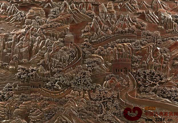 《清式檀香紫檀精雕萬里長城地座屏》(屏心局部雕刻)
