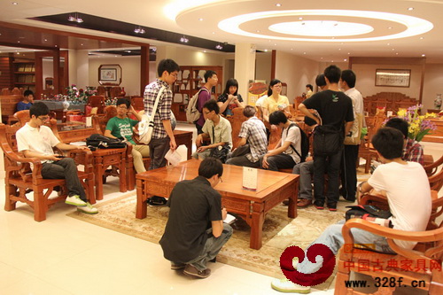 學子們在銷售主管的帶領(lǐng)下參觀紅木家具展廳