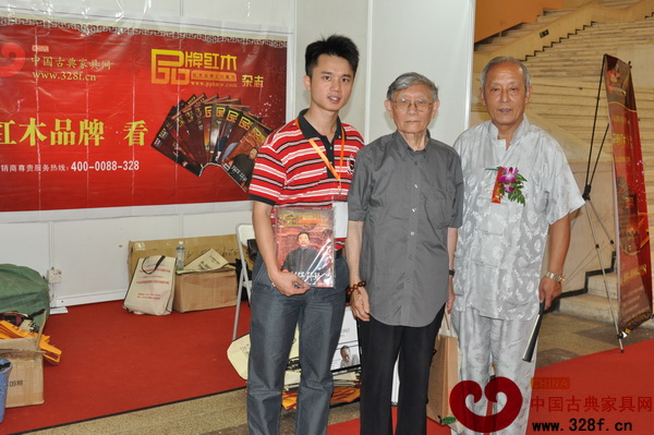 《紅木》國(guó)家標(biāo)準(zhǔn)第一起草人楊家駒(中)、傳承工藝大師、故宮家具修復(fù)專家王秀林(右)蒞臨展位,并與中國(guó)古典家具網(wǎng)CEO林偉華合影