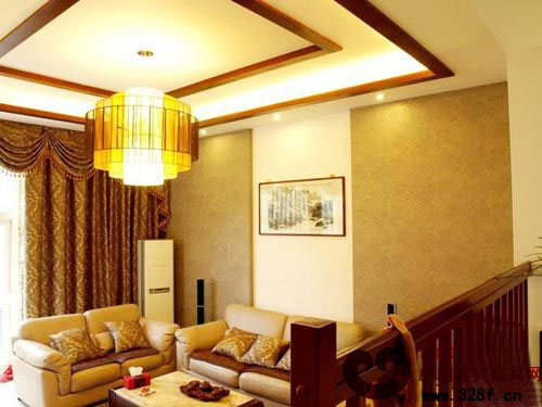 從樓上看客廳。沙發(fā)背景墻的兩側(cè)采用了咖啡色系,現(xiàn)代感油然而生;中間則是中國水墨畫,古典與現(xiàn)代在此融合。厚重的歐式窗簾高貴大氣。
