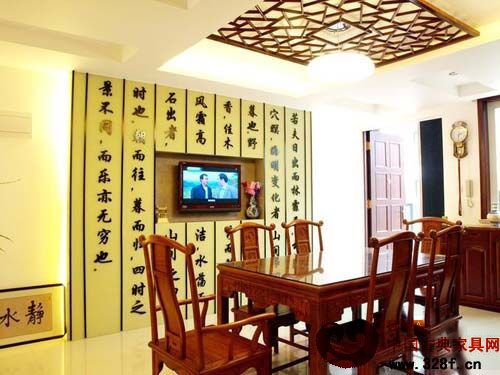餐廳背景墻采用了廣告中的亞克力字和宣紙色玉砂烤漆玻璃這些現(xiàn)代的材料來表達(dá)古讀本上的形態(tài),配以紅木雕刻家具,立即使微微“中”風(fēng)波瀾不驚的展現(xiàn)在大家面前。