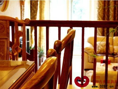 木質(zhì)樓梯柵欄很好的區(qū)分了用餐區(qū)和客廳,圓凳和茶幾是典型的中式造型,水晶燈和皮質(zhì)沙發(fā)簡約而時尚。