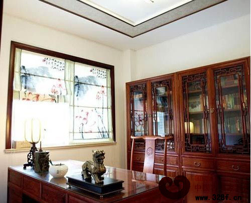 書房是純正的中式風(fēng)格,超強收納能力的書柜、中式的書桌、靠背椅、桌上獅子造型的藝術(shù)品以及類似宮燈的燈具,完完全全讓人仿若身在明清書香門第世家。窗簾更是創(chuàng)意性的用了水墨荷花,很有意境。
