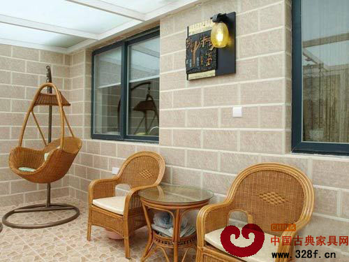 陽臺也是可圈可點的的,椅子、茶幾和吊籃都是藤制的,造型中西結(jié)合。地磚和墻磚則是完全的現(xiàn)代元素。墻上的燈具和掛畫點出了中式的主題。(編輯 田田)