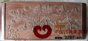 另外,該幾面板滿工精雕細琢一幅指日高升(或一品當朝)山水畫,由于該幾被設(shè)計成卷書式,該畫給人以無窮無盡,江山萬里之感。細膩精湛的雕工向人們展示了一幅一輪紅日畫龍點睛從東方冉冉升起,滿目皆是仙山瓊閣,蒼松翠柏,云蒸霞蔚,飛瀑競舸,瑞鶴飛翔,近景、中景、遠景布局得當,緊湊。同時,由于該幾在目前可查資料中絕無僅有,又屬案頭陳設(shè)。其稀缺性和藝術(shù)性被文博專家們一致評為上品,其市場價值不低于一件同時代、同品相的大型黃花梨家具,是古家具愛好者們心中的圣物。
