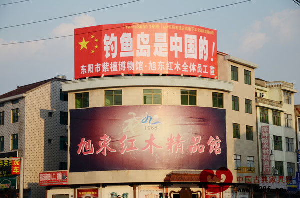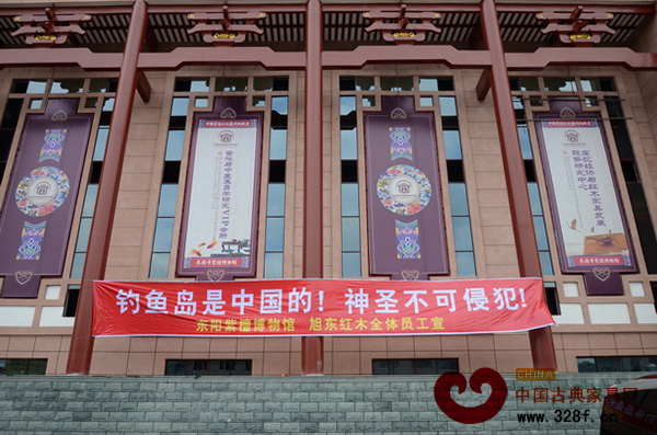 近段時(shí)間,隨著釣魚島事件的激化,舉國掀起了一股愛國主義熱潮。近日,浙江省東陽市旭東工藝品有限公司(簡稱“旭東紅木”)和由旭東紅木建造的浙江省東陽市紫檀博物館也打出了愛國標(biāo)語,標(biāo)語上寫到:“釣魚島是中國的——東陽市紫檀博物館 旭東紅木全體員工宣”的字樣。