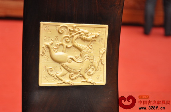 天圓地方茶座從總體來說,繼承了典型的明式家具的風(fēng)格,家具造型簡潔大方,不加多余雕飾,僅在座椅背板中間部分加入黃楊木龍形圖案鑲嵌,并輔以各種朝代的“龍”字字體。以明確的黃色點綴在紫光檀上,整體的視覺沖擊感強(qiáng)烈,但色調(diào)搭配卻又讓人覺得恰到好處。整套家具雖無太多的雕飾,但卻又在這僅有的方寸間將扎實的雕刻功底展露無遺,體現(xiàn)了卓木王紅木家具對東陽木雕工藝精髓的傳承。此外,天圓地方茶座在細(xì)節(jié)上加入了較多的現(xiàn)代元素,更加迎合現(xiàn)代審美情趣。