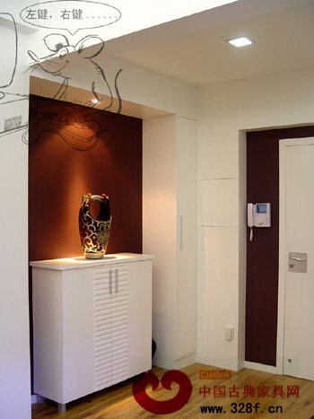 中式進門玄關效果圖:一進門的玄關設計,色彩簡潔,柜子還可以放鞋子等一些小零碎,超方便