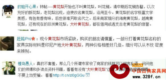 大葉黃花梨價(jià)格暴漲的新聞引起了業(yè)內(nèi)外高度關(guān)注,記者在網(wǎng)上搜索“大葉黃花梨”相關(guān)資料,卻發(fā)現(xiàn)“至今未定,國內(nèi)數(shù)家權(quán)威木材鑒定機(jī)構(gòu)無法在標(biāo)本庫內(nèi)找到相似比對樣,因此目前尚無定論”的結(jié)論,甚至有資料解釋為“比鐵還堅(jiān)硬的木頭”。隨后,記者在新浪微博輸入“大葉黃花梨”5個(gè)關(guān)鍵字后,卻發(fā)現(xiàn)大部分網(wǎng)友對大葉黃花梨暴漲新聞大吐不快。