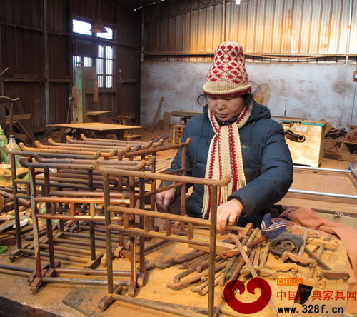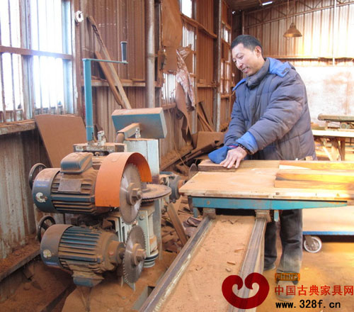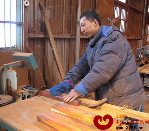 企業(yè)車間內(nèi),工人正在打磨紅木