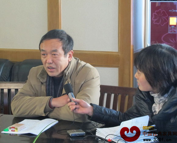 麒麟紅木制品協(xié)會秘書長孫建豪(左)介紹麒麟紅木產(chǎn)業(yè)發(fā)展情況