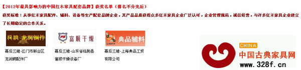 在眾多紅木家具配套品牌企業(yè)中,江門市新會區(qū)龍潤銅配件廠、山東省臨朐縣富順干燥設(shè)備廠、上海典品工貿(mào)有限公司在角逐中脫穎而出,斬獲“2012年最具影響力的中國紅木家具配套品牌”。