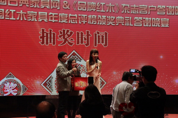 答謝晚宴上,東成紅木總經(jīng)理張錫復(fù)應(yīng)邀作為一等獎(jiǎng)的抽獎(jiǎng)嘉賓進(jìn)行獲獎(jiǎng)?wù)叩某檫x