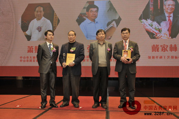 全國(guó)工商聯(lián)民間文物藝術(shù)品商會(huì)會(huì)長(zhǎng)、中國(guó)傳統(tǒng)家具研究會(huì)會(huì)長(zhǎng)宋建文(右二),中國(guó)古典家具網(wǎng)、《品牌紅木》雜志CEO林偉華(左一)與中國(guó)紅木家具行業(yè)貢獻(xiàn)終身成就獎(jiǎng)獲獎(jiǎng)?wù)吆嫌?/FONT>