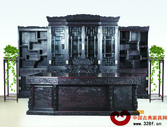 我們一般將紅木書房分為三類:政務書房、商務書房和家居書房。首先從政務書房說起:室內(nèi)一圈椅一書桌,桌上置筆筒及其他一應文房四寶,這是必不可少的。因為是政務之用,文氣十足的圈椅后面加置地屏,無形中凸顯了主座的寶相,烘托了主人的地位;上通透下封閉的萬歷柜作為書柜,既陳設又儲存,同樣也是必要,尤其半開放半封閉的功能效果很貼切,不動聲色之際顯示出從政之人的城府;為了增強室內(nèi)家具的陳設功能,再配置一對三彎腿花幾,放上花盆,施以點綴,緩和氣氛,如果空間允許,再分別配置宮燈架一對和衣帽架一個,前者作裝飾,后者作使用。