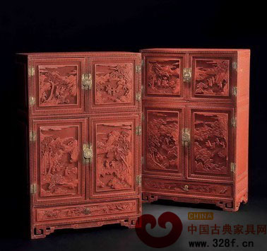 此外,該場封面的“清乾隆剔紅慶壽圖柜一對(duì)”亦是呈現(xiàn)了宮廷漆雕的面貌。此對(duì)剔紅小柜具備了所有上述乾隆宮廷雕漆的特點(diǎn),于柜門處雕琢寓意深遠(yuǎn)的山水人物圖案,兩側(cè)面及頂面則是裝飾錦紋。小柜整體制作氣勢堂皇,技法精湛,宮廷氣息濃厚,實(shí)乃乾隆時(shí)期宮廷漆器巔峰之作,具有典型的代表性。成對(duì)保存更為難得。臺(tái)北與北京故宮博物院亦藏有此類剔紅小柜,可資參考。