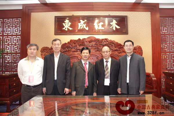 中國林產(chǎn)工業(yè)協(xié)會執(zhí)行會長王滿(左三)、大涌黨委書黃紅全(左二)一行蒞臨東成紅木參觀指導(dǎo)