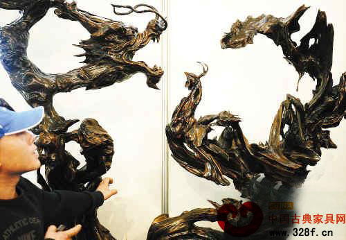 根雕講究“七分天成,三分雕琢”,圖為惟妙惟肖的根雕作品《龍鳳呈祥》