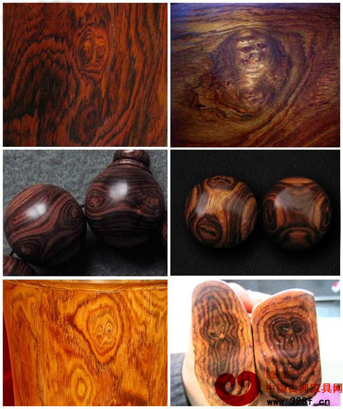 鬼臉紋:黃花梨樹上一個樹杈,反映到主干上時,會形成一個癤痕,這個癤痕就叫鬼臉,鬼臉像一張臉一樣,要讓人一眼看去能想象出一張臉或一張動物臉叫做鬼臉紋,鬼臉也稱為“鬼臉兒”“ 娃娃臉”,下圖所示: